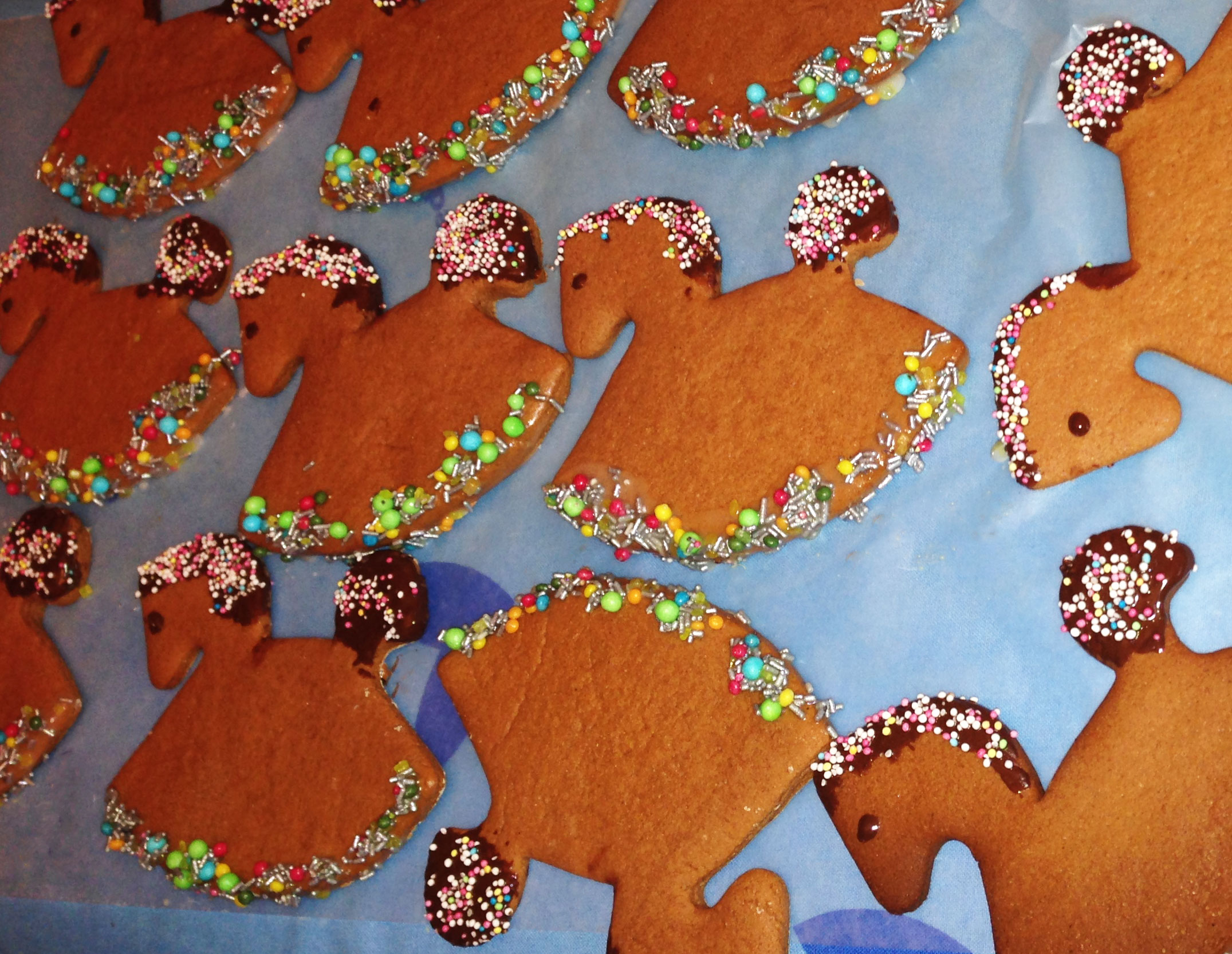 Alles zu einem glatten Teig verkneten und (z.B. kurz im Gefrierfach) gut abkühlen lassen. ½ cm dick ausrollen und mit Pferdchenformen ausstechen. Bei 170 Grad 10-15 Minuten (mittlere Schiene auf einem mit Backpapier ausgelegten Backblech) backen. Vorsicht: die Lebkuchenpferdchen sind sehr weich, wenn man sie aus dem Rohr nimmt. Sei vorsichtig, sonst brechen sie. Gut auskühlen lassen und nach Belieben verzieren (z.B. mit Schokoguss, Streusel, Belegkirschen, Mandelkernen…)